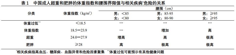 (1) 体质指数(BMI)为体重除以身高的平方(kg/m2),BMl=体重/身高2(kg/m2) 。在中国BMl<18.5kg/m2为消瘦;BMl 在18.5~23.9kg/m2之间为正常;BMl≥24kg/m2为超重;BMl≥28kg/m2为肥胖。
