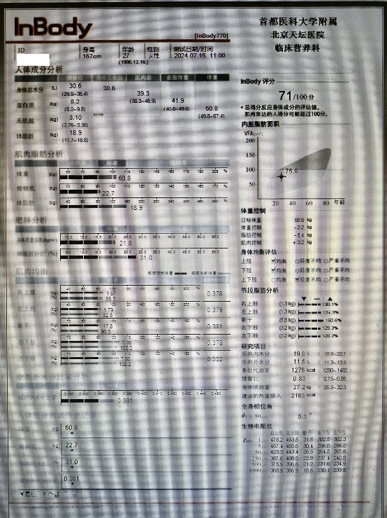 先安慰患者不要着急,仔细询问患者病史及膳食史,并做了相关测量及检查:患者自诉4月前自觉“肥胖”,想减重,看了一些网络上的视频,觉得生酮饮食不用管住嘴迈开腿减重迅速,近3月开始自行采用生酮饮食减重,每天吃1-2餐,不吃主食,肉类食物摄入未减少,但并未摄入大量油脂类食物,不吃水果、不喝饮料,平素活动极少,体重下降了15斤,却发现自己例假延迟3月未来,头发也比生酮减肥前掉的厉害,自觉发量明显减少,认为是生酮饮食惹的祸,继而停止生酮,恢复到每日3餐,主食、水果、饮料等均摄入量偏高,结果体重一月增加15斤,月经又恢复了,但是体重增加太快了,患者很担心自己的身体故而来诊患者身高167cm,体重60.8kg,BMI 21.8kg/m2,腰围76cm,臀围89cm,右手握力20kg。完善人体成分分析检查显示肌肉量39.3kg(参考范围38.3-46.9kg),体脂肪18.9kg(参考范围11.7-18.8kg),体脂率31%(参考范围20%-30%),内脏脂肪面积75.9cm2(参考范围<100cm2),患者体成分分析提示肌肉含量少、脂肪含量高,内脏脂肪面积虽在参考范围内,但对于27岁的小姑娘来说还是偏高的。患者此时着了急,医生我该怎么吃啊?