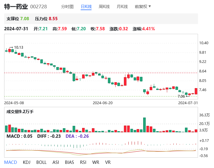 截至7月31日,特一药业总市值38.71亿元。