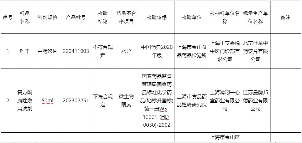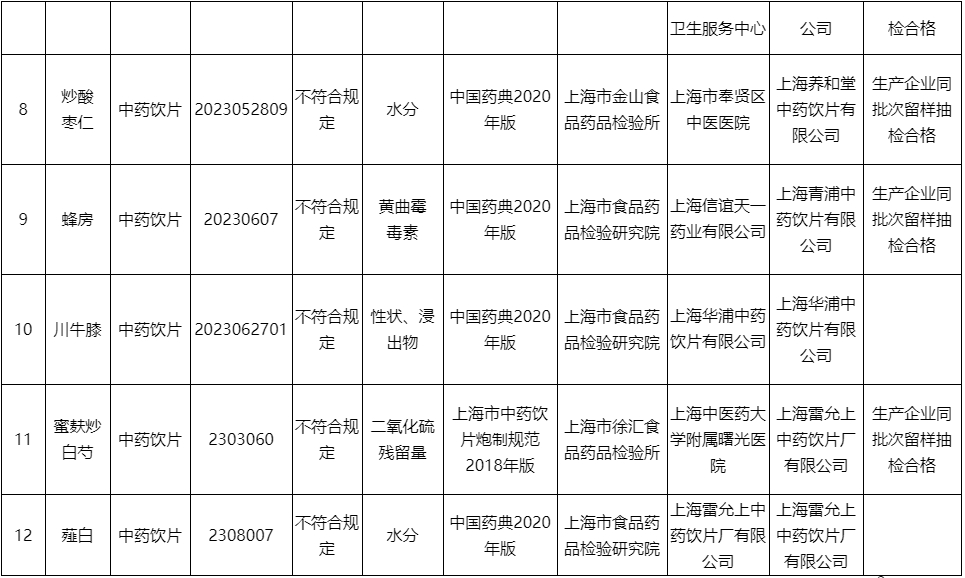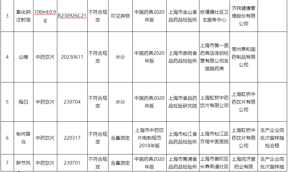 这些不符合规定的产品包括:北京仟草中药饮片有限公司生产的射干(水分),江苏晨牌邦德药业有限公司生产的复方酮康唑发用洗剂(微生物限度),济民健康管理股份有限公司生产的氯化钠注射液(可见异物),常州泰和国药制品有限公司生产的山楂(水分),上海虹桥中药饮片有限公司生产的薤白(含量测定)和制何首乌(含量测定),上海同济堂药业有限生产的肿节风(含量测定),上海养和堂中药饮片有限公司生产的炒酸枣仁(水分),上海青浦中药饮片有限公司生产的蜂房(黄曲霉毒素),上海华浦中药饮片有限公司生产的川牛膝(性状、浸出物),上海雷允上中药饮片厂有限公司生产的蜜麸炒白芍(二氧化硫残留量)和薤白(水分)。