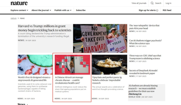 9月19日,学术期刊《Nature》新闻头版以“A Chinese AI tool can manage chronic disease -could it revolutionize health care?”为题,聚焦中国人工智能浪潮之下慢病管理的创新模式,并着重介绍了方舟健客杏石医疗大模型的技术底座及研发背景。