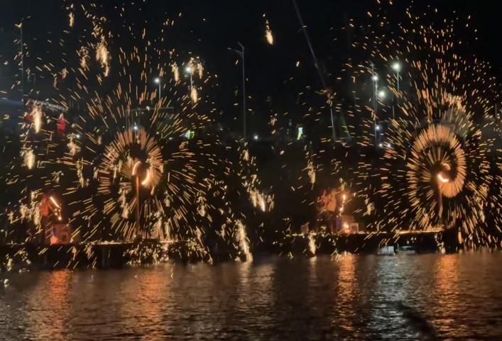 此外,园区中设立了非遗展演区,集中展示传统民俗节目,让游客在赏灯之余感受中华传统节庆文化的独特魅力。夜色中,打铁花将铁水化作漫天银花如星河倾泻,火树银花映亮湖边夜色,承载着新春吉祥祈愿。