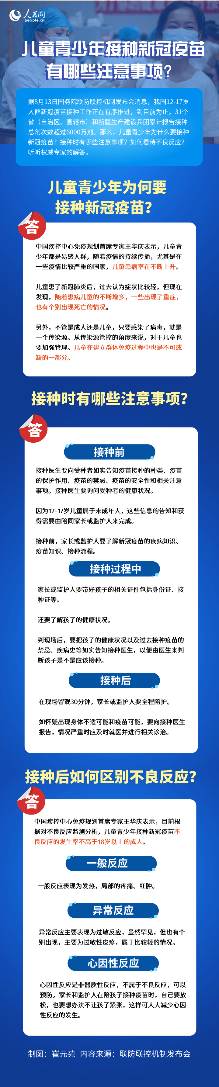 据8月13日国务院联防联控机制发布会消息,我国12-17岁人群新冠疫苗接种工作正在有序推进,到目前为止,31个省(自治区、直辖市)和新疆生产建设兵团累计报告接种总剂次数超过6000万剂。那么,儿童青少年为什么要接种新冠疫苗?接种时有哪些注意事项?如何看待不良反应?听听权威专家的解答。