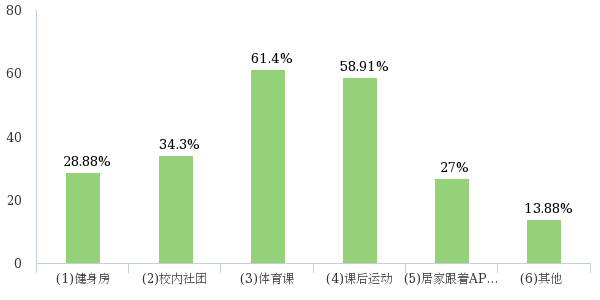 对不同学段青少年进行比较发现,大学生更倾向于健身房和居家跟着APP运动,而初中生和高中生更喜欢校内社团的运动形式。另外,大学生对课后体育运动形式的喜爱位居第一位,比体育课高了6个多百分点;选择健身房的比例也分别高出初中生和高中生17个、11个百分点。而初中生、高中生喜爱的运动形式都是体育课高于课后运动。这可能是因为大学生能自主的时间更多,因此更多选择课后运动、健身房运动。