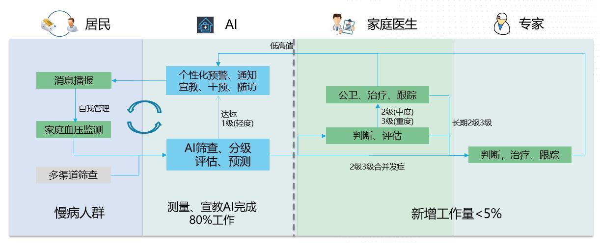 人机协同慢病管理。由界首市人民医院牵头,采用分层(县乡村分层)分级(轻症重症分级)慢病管理模式,通过智能可穿戴硬件实时采集精准的健康数据,通过人工智能完成简单的高频管理任务,包括自动对居民进行健康状况评估和分级,并提供有针对性的健康干预方案,辅助基层医生进行分类分级管理,提升慢病管理效率与效果。