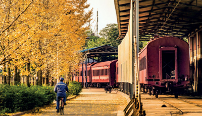 走进园区的西大门,门边满是铁锈的圆形高炉上方立着挥手向前的乐团指挥塑像,高大的烟囱、生锈的铁管、各种各样的雕塑,营造出光怪陆离的视觉效果。火车头广场是园区内工业气息尤其浓郁的地方:一台蒸汽机车拖着几节绿皮车厢,静静地等候在铁轨之上,隐没在厂房内的车身仿佛随时都会鸣笛向前。