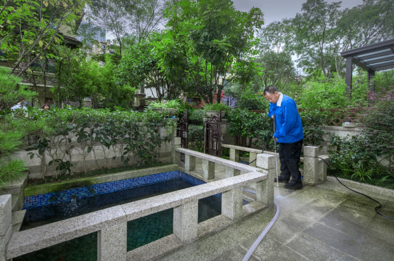 (工作人员帮龙民打理私家花园)