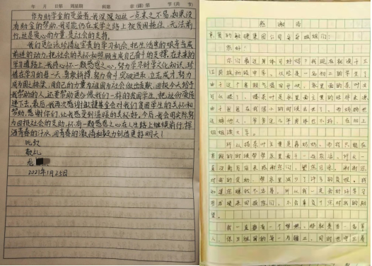 厚积流光,温暖无声。春节前夕,结对帮扶的首批学子纷纷向敏捷集团高管等资助者寄来信件,汇报了自己的生活和学习近况,并由衷表达了感激之情。从学子们稚嫩的笔记上,暖心且朴实的话语中,可深刻感受到他们的生活正逐渐变好,他们亦坚定的表示,将努力学习,争取早日回报社会。
