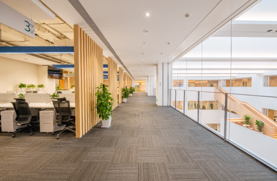 建筑顶端“龙湖蓝海引擎产业园”标识牌赫然醒目:外立面设计巧妙,渐变色格栅,不仅美观、防西晒,且不同视角所见是不同风景;北向斜坡的玻璃屋顶,专门测算过角度,能让天光均匀地洒进中庭,还能避免夏季高温曝晒,低碳节能;平层展开的大空间,被分割成会议区、集中办公区、公共协作区、茶歇休闲区等,互相之间既有分隔,又能连通;原木色与白色为主色调的软装设计,不仅舒适环保,也让整个空间淡雅明亮。