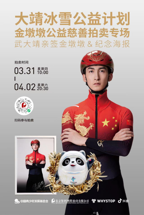 “给金墩墩找个好人家!”两届冬奥会冠军武大靖3月29日宣布“大靖冰雪公益计划 金墩墩公益慈善拍卖专场”正式启动,拍卖个人获得的北京冬奥奖牌选手专属吉祥物金墩墩以及8幅限量版亲签海报。本次慈善拍卖将在北京保利拍卖网拍平台上进行,所得善款将直接捐赠至中国青少年发展基金会“希望工程·大靖冰雪公益计划”,用于推广青少年冰雪运动。