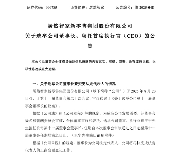 新华网北京8月21日电(记者王日晨)8月20日,居然智家新零售集团股份有限公司(证券简称居然智家)发布公告称,根据《公司法》和《公司章程》等的规定,为适应公司发展需要,经董事会提名和薪酬委员会审核,全体董事审议和表决,选举公司董事、执行总裁王宁担任公司第十一届董事会董事长,任期自本次董事会审议通过之日起至第十一届董事会任期届满之日止。