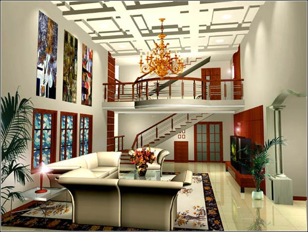 客厅:双层开敞式空间。通过对色彩的变化构成空间的交变,统一的视像背景及大理石柱式,以及彩绘窗,透出主人深蓄的古文化修养。