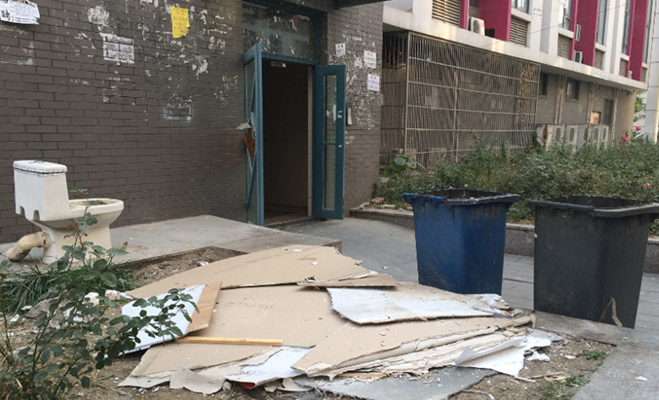 小区内多处杂草密布,生活垃圾和装修垃圾随处可见,业主告诉记者,“这些垃圾也没人清扫,堆在这儿也很长时间了”。