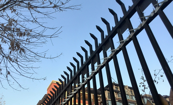保安对小区进行24小时巡视,并配有防暴钢叉等安防装备。小区的围墙栅栏设有金属刺,具有较强的防攀爬功能。小区实现了严格的人车分流。