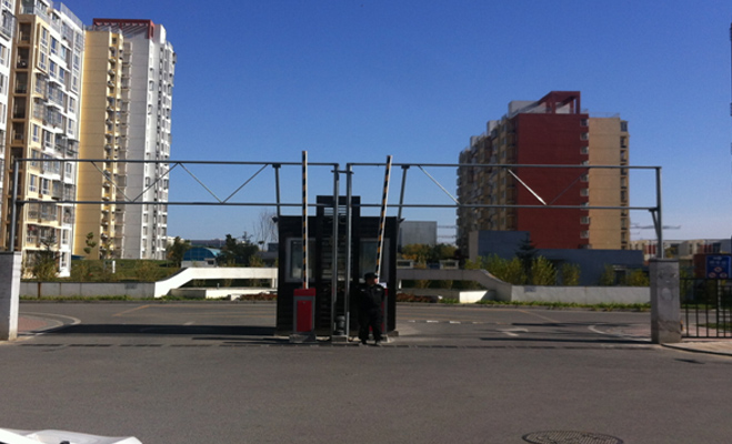 社区门口没有设置大门,由几个简单的铁管焊接的架子形成了“门”的标志。安保人员时而交头接耳时而摆弄手机,对于进出的车辆、人员置之不管。