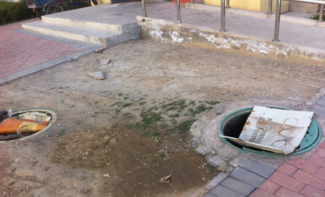 而在门单元入户门的位置记者还看到了下面的场景,两个井盖已经不见了踪影,上面被铁皮、袋子简单覆盖。有一个井甚至一半的位置都在人行道上,距离无障碍通道不过一两米的距离,业主对此抱怨,肯定不敢放孩子自己出来玩儿。