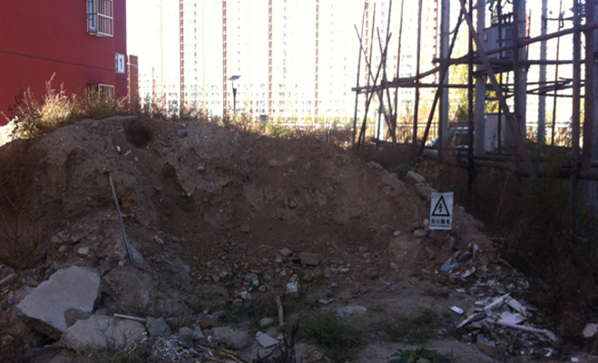 在小区东北侧,有一个规模不小的变电场所。林立的电线杆以及交错的电线看上去十分扎眼,而且除了几根固定用的脚手架四周并无隔离带,当心触电的警示牌就被放置在渣土堆上,简陋的防护措施让人揪心。