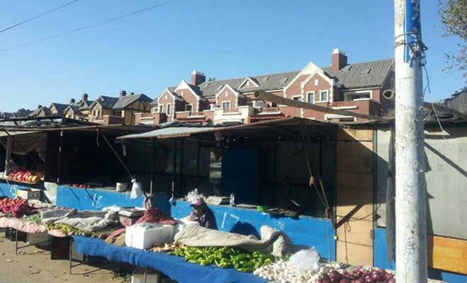 在前往项目的道路上公交车颠簸不堪,道路两侧也尽是拆到一半的建筑物,飞扬的尘土让人喘不过气。部分路段不仅湿滑不堪而且散发着阵阵恶臭。在小区底商位置,由于长时间没有商家入驻,已经长满了杂草,门前空地位置还有车辆停靠。人行道一侧甚至出现了塌陷,从现场来看已经长时间无人打理。