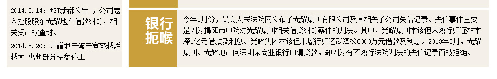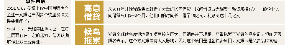 兴润崩盘,曾被媒体评论为“推倒了2014年中小房企崩盘的第一张多米诺骨牌”。随后,资金链断裂、房企破产、项目烂尾等声音此起彼伏,这些案例中,最令市场关注的,莫过于近日疯传的“光耀地产资金链断裂”事件。5月7日光耀地产公开发表声明,承认公司面临资金链问题,但否认了濒临破产的说法,之后也表示愿意接受其他企业的收购。 |