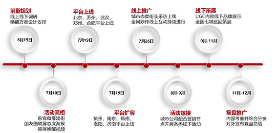 唤醒活动从7月10日开始前宣,7月12日起城市平台开放,期间结合街头采访、软文投放等持续全网炒作,8月起嫁接各类线下活动, 9月至12月深化唤醒内容,进行线下巡回策展,实现二次推广。