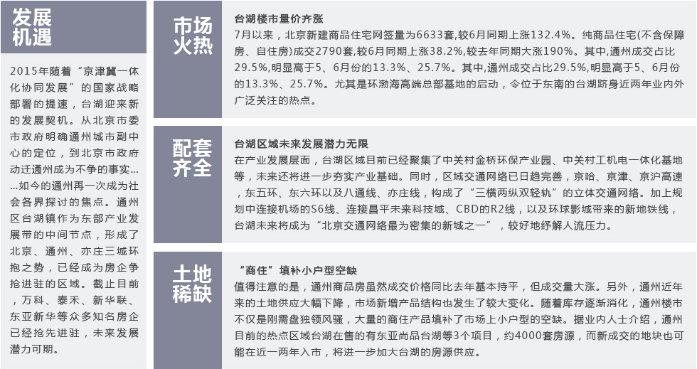通州在“京津冀一体化协同发展”的背景中,以北京城市副中心为核心向导,从环球影城落地台湖附近到四通八达交通网络密集覆盖再到积分落户……层层利好不断释放,这里正在以前所未有的态势腾飞;其中通州区台湖镇,作为东部产业发展带的中间节点,形成了北京、通州、亦庄三城环抱之势,成为今年新房市场的主要供应区域之一。