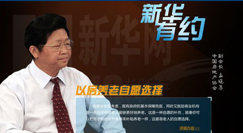 9月13日,国务院发布了《关于加快发展养老服务业的若干意见》 (以下简称《意见》,重点提出“开展老年人住房反向抵押养老保险试 点”,在网上引起热议。9月26日,汇利基金董事长、幸福人寿原董事 长孟晓苏教授做客由新华房产和新华网采访部联合推出的《新华有约》 栏目,与网友交流如何看待“以房养老”等热点话题。