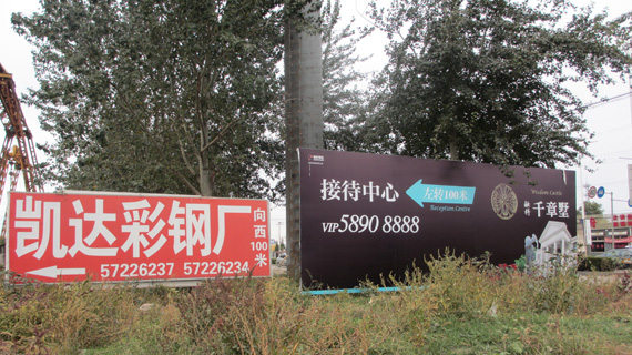 “你看到那个千章墅的大广告牌没?原来那下面是个大垃圾坑,现在开发商把这种点草掩盖了,为了打广告。”说话间,一位附近村民赶着一群羊群经过。村民说,这些羊群每天就在别墅旁的草地上放养。
