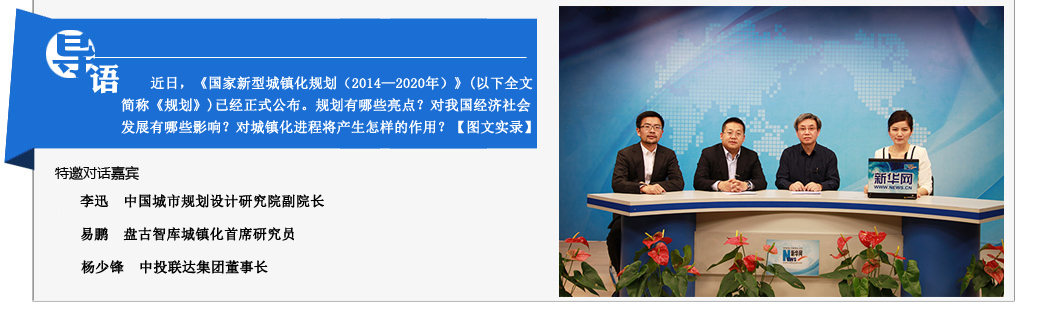 近日,《国家新型城镇化规划(2014—2020年)》已经正式公布。这部全文3万多字,共计30多章的规划有哪些亮点?对我国经济社会发展有哪些重要影响?对我国城镇化进程将产生怎样的作用?本期《新华有约》共同探讨。
