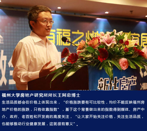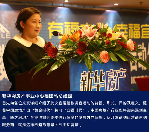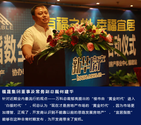 10月31日下午15:30,以“有福之州 幸福宜居”为主题的“新华宜居指数全国大调查福州站启动仪式”隆重举行。本次启动仪式由新华网房产事业中心主办,福建省房地产业协会协办,新华网房地产事业中心福建站承办。 福建省房地产业协会常务副会长张天任,福建省广告协会会长、住宅产业商会副会长黄应寿,福建省住建厅城建处领导吴肩宇,福建省房协开发委秘书长方健民,福建省宜居办负责人刘艽明,福州大学房地产研究所所长王阿忠博士,地产专家刘福泉,福州市房地产开发建设促进会会长、福晟集团董事及常务副总裁何建华,福建省国土资源厅、环保厅、文化厅相关专家领导,福建各大主流新闻媒体、福州地区房地产开发企业代表泰禾、保利、三盛、杉林、中辉、深深及社会各界代表共同见证此次启动仪式。【详情】
