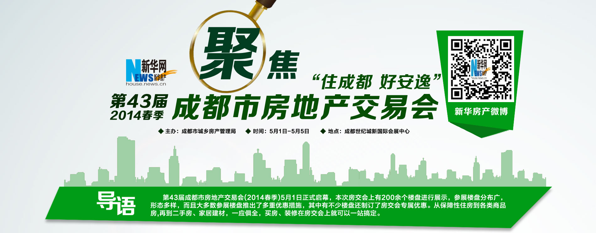 | 据了解,以“住成都 好安逸”为主题的本次春季房交会,将在世纪城新国际会展中心1-4号展馆举行,而“绿色、节俭、环保”将成为房交会的一大特点。 |