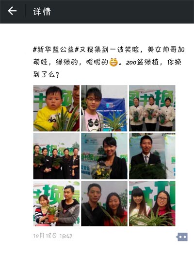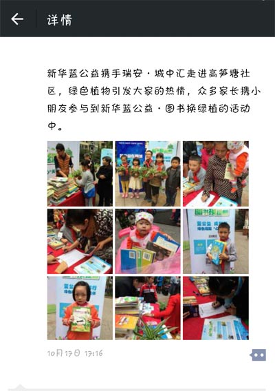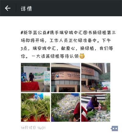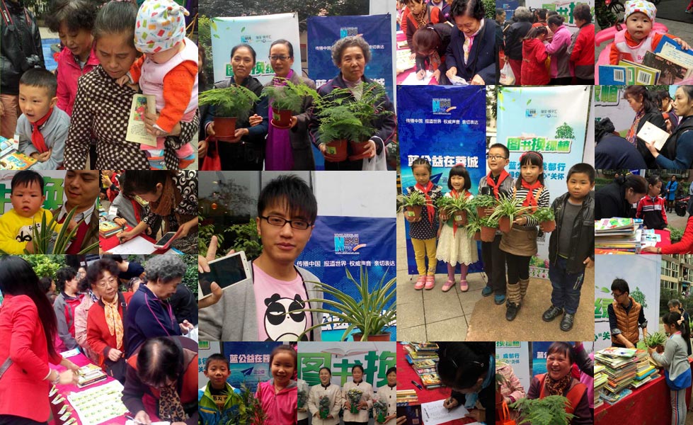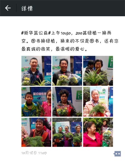 蓝公益·图书换绿植活动宗旨在于宣传绿色、生态、环保理念,增进市民对公益的理解,以平台的辐射效应使公益活动更贴近社区、更贴近居民、更贴近生活。以一本图书换一盆绿植的方式传递爱心,置换的图书将捐赠于灾区学校等。借新华蓝公益平台,给需要帮助的人带来更多的关爱。