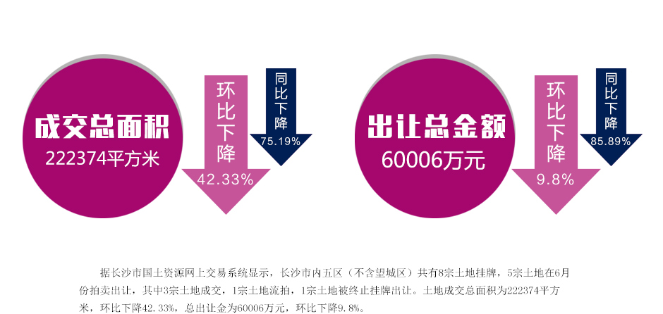 据长沙市国土资源网上交易系统显示,长沙市内五区(不含望城区)共有8宗土地挂牌,5宗土地在6月份拍卖出让,其中3宗土地成交,1宗土地流拍,1宗土地被终止挂牌出让。土地成交总面积为222374平方米,环比下降42.33%,总出让金为60006万元,环比下降9.8%。[详情点击]