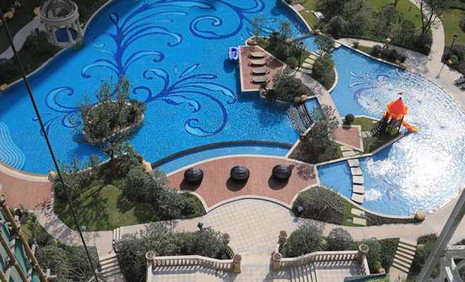 据资料显示,大名城绿化率为41.5%,楼间距为160米,小区内部区规划拥有中央叠瀑和中央泳池。目前,大名城东区1400㎡无边界游泳池已经开放使用。记者实地走访泳池周边发现,一名工作人员正在清理池内杂物,该工作人员告诉记者,大名城工作人员会定时清理泳池及周边景观区域,保证小区内部时刻干净整洁。纵观东区整体景观,池水清澈,周边花卉植物、雕像喷泉错落有致,景观整体格调高端。
