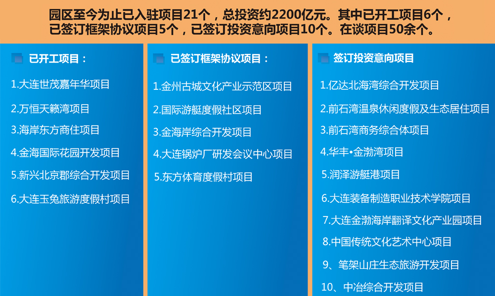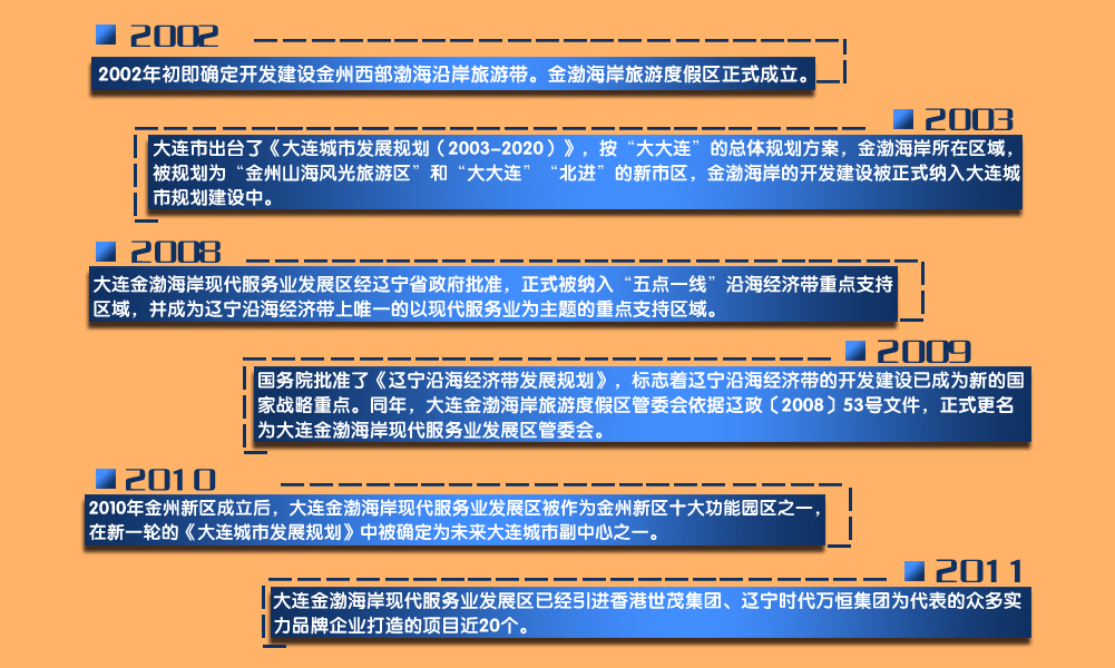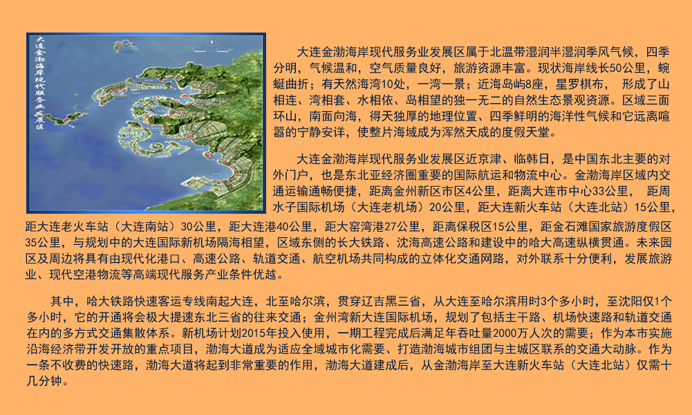 按照辽宁省和大连市对大连金渤海岸现代服务业发展区的定位,未来10年中,这里将建设成拥有50万从业人口,集商贸金融、休闲运动和特色旅游等高端现代服务功能的产业基地,并最终打造成为世界一流的现代服务业集聚区和著名的滨海旅游度假胜地。……【详细】