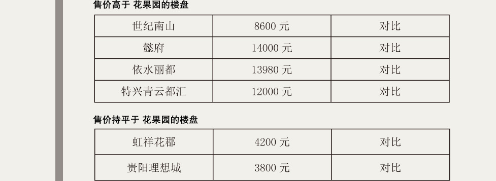 2014年07月,最新售价显示,贵阳市所有28个在售住宅项目与花果园相比:25个项目的销售均价高于花果园,售价最高的亨特国际金融中心为25000元/平方米,占总数的92.6%;另有2个项目的销售均价与花果园持平。 |