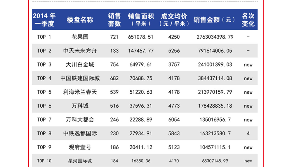 | 在2014第一季度贵阳楼市龙虎榜中,通过专业的数据机构统计显示,花果园毫无悬念再次夺魁,以7211套的销售业绩独霸贵阳排行前十近60%的市场份额。 |