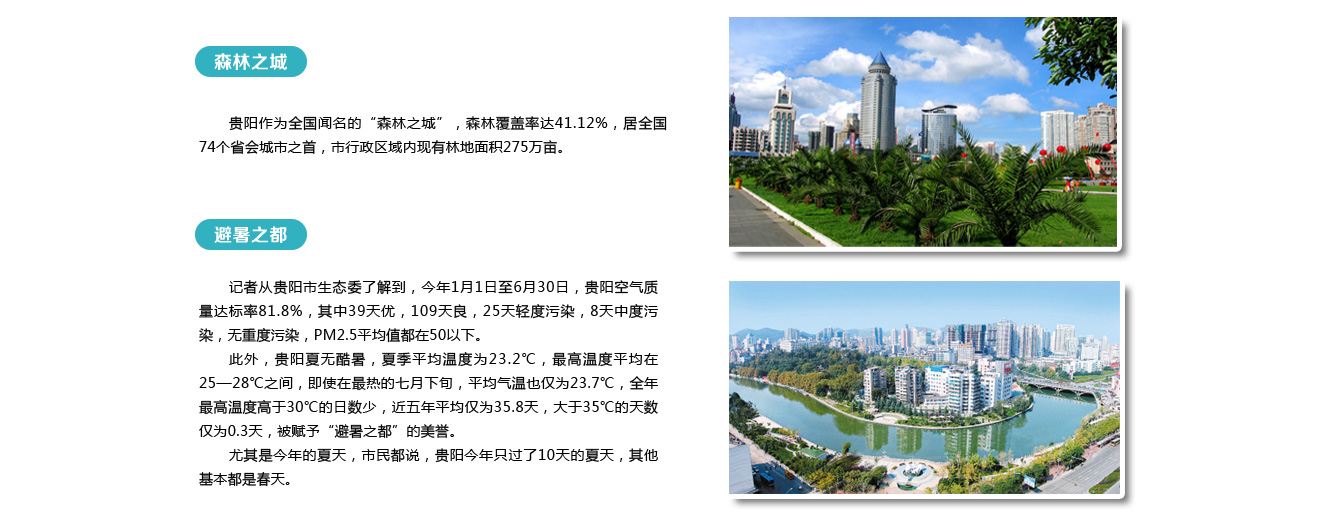 | 作为喀斯特地貌发育典型的地区,贵阳的旅游资源十分丰富,拥有以"山奇、水秀、石美、洞异"为特点的自然景观和人文旅游资源,并将旅游业发展目标定位于"森林之城,休闲胜地",构建以森林旅游、喀斯特生态旅游和民族文化旅游为主体的旅游产品体系,四周分布着省内的12个国家级风景名胜区,19个国家级重点文物保护单位,7个国家级自然保护区和两个历史文化名城,既有红枫湖、开阳峡谷生态公园等以山、水、林、洞为特色的高原自然风光,又有如阳明洞、青岩古镇和息烽集中营旧址等文化内涵极为丰富的人文景观,还有古朴浓郁、多姿多彩的少数民族风情。目前,贵阳市旅游业规模不断扩大,接待能力大为增强,全市旅游产业体系基本形成,迎接着全国各地慕名而来的游客。 |