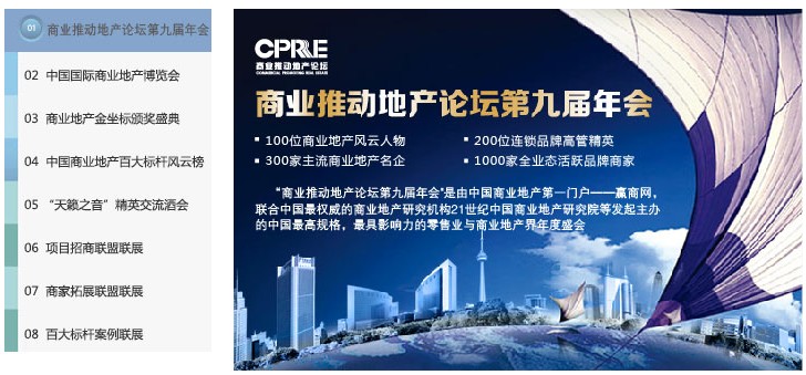 “商业推动地产论坛”于2006年迄今,已成功举办了八届,并于2010年同期成功举行“中国国际商业地产博览会”。伴随着中国商业地产的发展,该活动已成为行业风云人物的言论阵地和同行的交流平台,是中国一流地产企业、国内外品牌商业企业、国内外金融机构在中国市场共同谋略产业交流、合作、招商顶尖的涉外高端商务平台,也是目前中国商业地产行业唯一集品牌展示、招商对接、高端论坛、颁奖盛典、年度盛事盘点于一体的行业奥斯卡盛会;也成为各行业组织共同推进的,商业地产领域中规格最高、最具品牌价值和影响力的行业年度盛会!