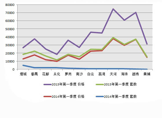 根据房王网统计数据显示,2014年一季度广州十区二市网签一手住宅16136套,同比2013年第一季度成交(27042套)下跌约40%,环比下跌32.5%;成交面积1843606平方米,同比下跌42.1%,环比下跌30.2%;成交均价13821元/平,同比下降0.2%,环比上升1%。