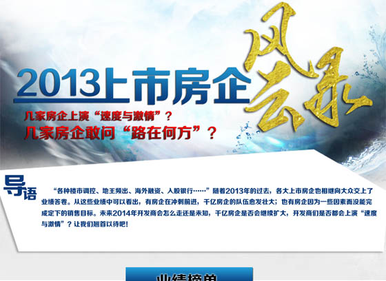“各种楼市调控、地王频出、海外融资、入股银行……”随着2013年的过去,各大上市房企也相继向大众交上了业绩答卷。从这些业绩中可以看出,有房企在冲刺前进,千亿房企的队伍愈发壮大;也有房企因为一些因素而没能完成定下的销售目标。未来2014年开发商会怎么走还是未知,千亿房企是否会继续扩大,开发商们是否都会上演“速度与激情”?让我们翘首以待吧!
