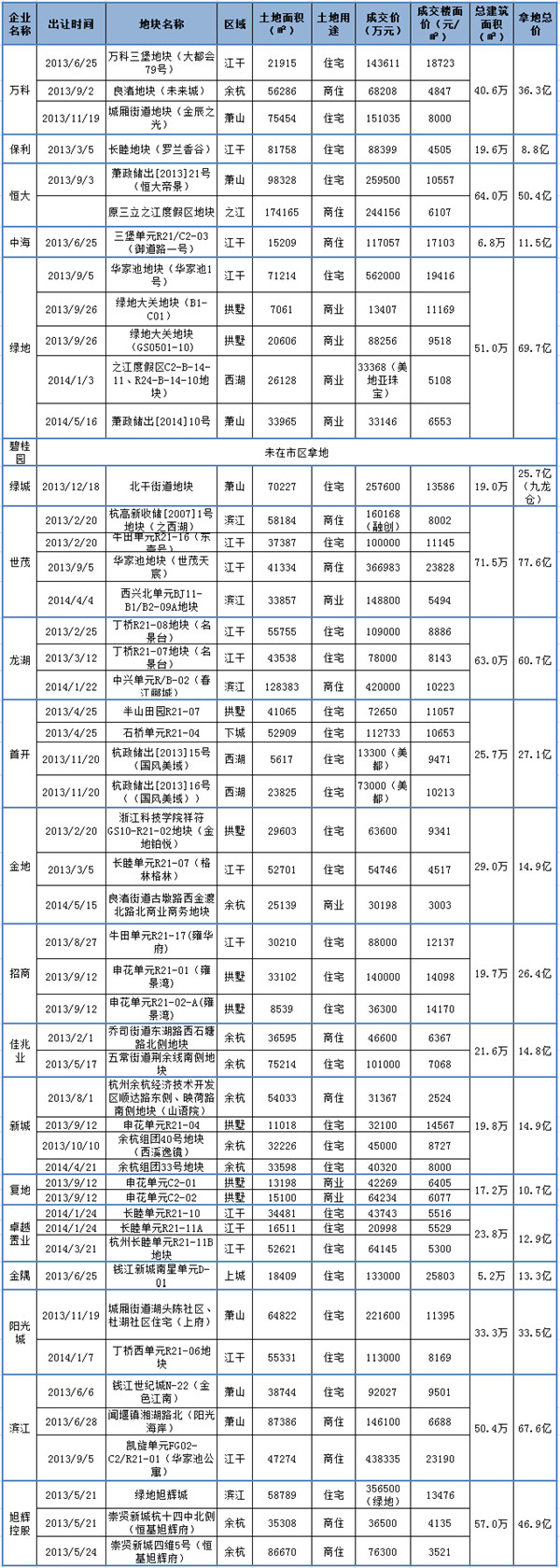 近两年的杭州楼市,外来房企的面孔越来越多见,他们拿地时的大手笔和操盘时高效的融资渠道、成熟的营销模式,让本土房企在这场不见硝烟的战争中逐渐败下阵来。这一点很好的体现在土地市场上,据统计数据显示,2013年杭州全城企业拿地前十名中本土企业仅有滨江一家,其他9家都被外来大鳄承包了。 【详细】