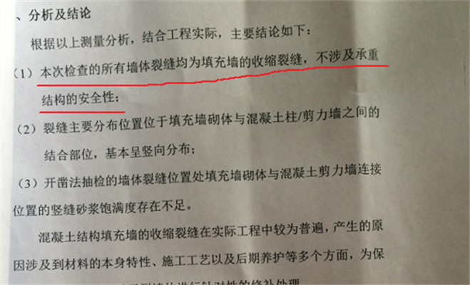 在报告的最后一页,记者看到分析与结论为:“本次检查的所有墙体裂缝均为填充墙的收缩裂缝,不涉及承重结构的安全性”。