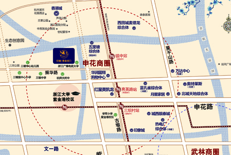 小区以紫荆花路为纵向主轴,可连接金渡北路、文一西路、天目山路和规划中的地铁5号线;东西向可以走留祥路,可以到达绕城高速、上塘高架、莫干山路;距离紫金港路延伸段也不远,通往紫之隧道,方便到达之江、滨江等区域。