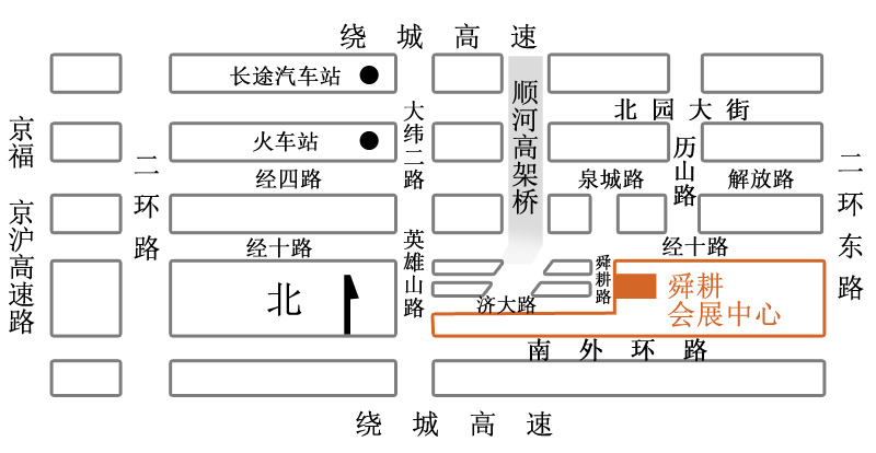 济南市区的朋友,乘坐39、48、64、66、85、110、152、K100、公交车至"会展中心"站下车,路东即是。 外地的朋友,假如您坐火车来济南,在济南火车站搭乘K51路公交车到"省中医"站下车,换乘66、85、K100路公交车至"会展中心"站下车,路东即是;若是坐长途汽车到济南,您可以从长途汽车站乘坐5、72路公交车到"泉城广场"站下车,换乘66、K100路公交车到"会展中心"站下车即可。