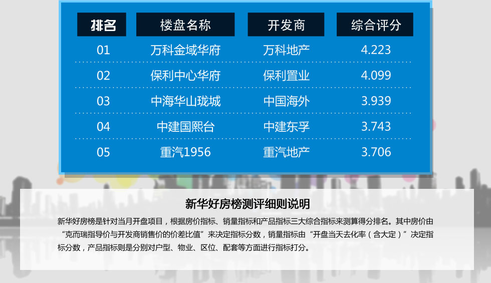 8日,由新华网房产中心山东频道联合克而瑞房价点评网共同推出的《新华好房榜》发布8月榜单。此次上榜楼盘共有5个,分别是万科金域华府、中建国熙台、中海华山珑城、保利中心华府、重汽1956。其中有3个楼盘是偏改善型楼盘,只有万科金域华府和中海华山珑城是刚需产品。