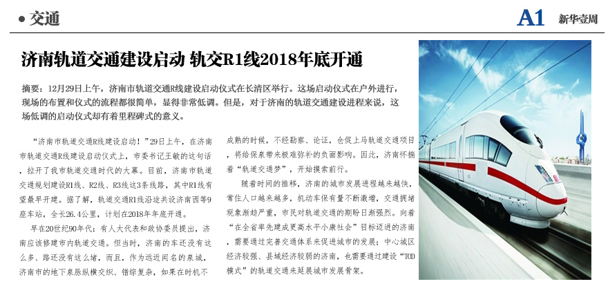 济南轨道交通R1线2018年底开通