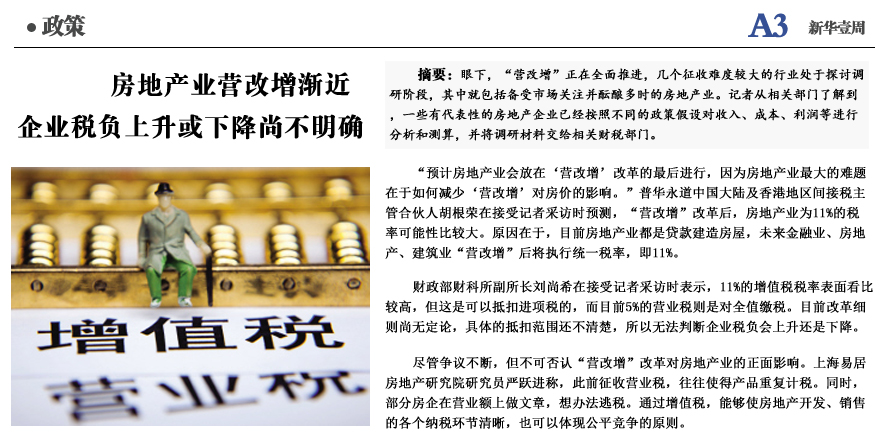 房地产业营改增渐近 或执行税率11%