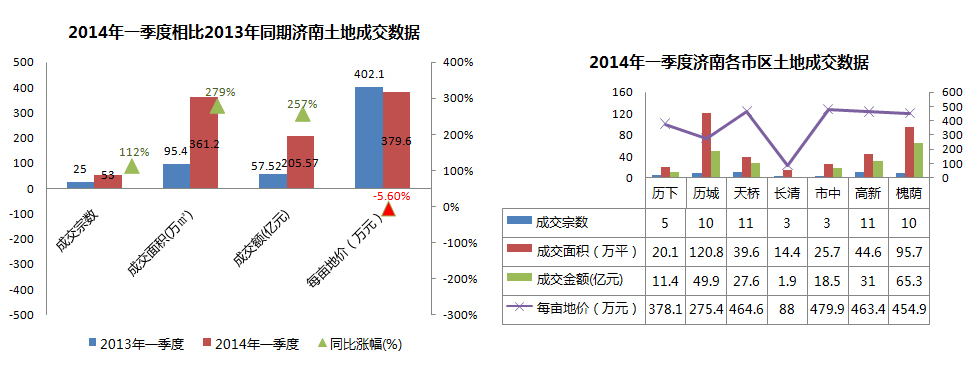 2014年1-3月济南共成交土地53宗,同比上涨112%;成交面积361.2万平方米,同比上涨279%;成交金额205.57亿元,同比上涨257%。