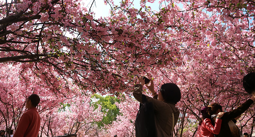 花树下游客们纷纷掏出相机留住美好的瞬间。