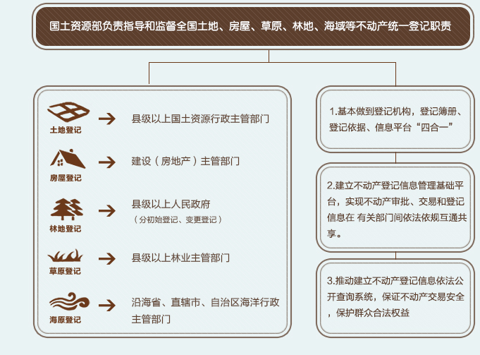 不动产统一登记,是由2013年11月20日召开的国务院常务会议决定,整合不动产登记职责、建立不动产统一登记制度。由国土资源部负责指导监督全国土地、房屋、草原、林地、海域等不动产统一登记职责,基本做到登记机构、登记簿册、登记依据和信息平台“四统一”。各地在中央统一监督指导下,结合本地实际,将不动产登记职责统一到国土资源部一个部门。 |